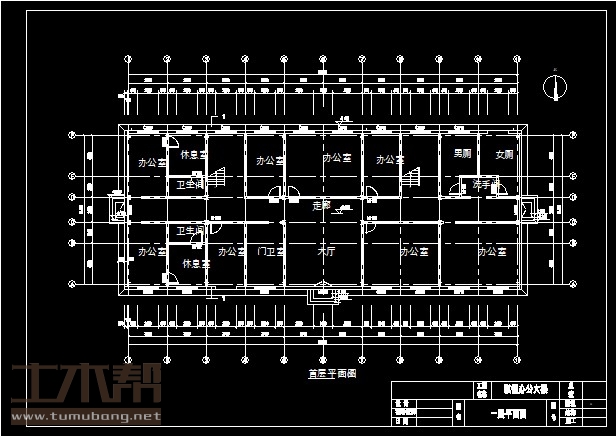 一层:办公室3.75m*6m*5间,休息室3.75m*4m*2间,卫生间3.75m*2m*2间,门卫室3.75m*6m*1间,大厅7.5m*6m*1间,办公室7.5m*6m*3间,楼梯间3.75m*6m*2间,男厕3.75m*6m*1间,女厕3.75m*6m*1间;
