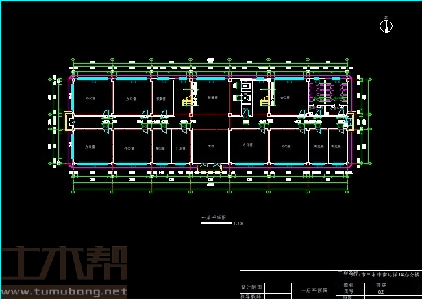 一层:大厅6.6m*7.2m*1间;候梯厅6.6m*7.2m*1间;楼梯间3.6m*7.2m*2间,阅览室3.6m*7.2m*2间,厕所3.6m*7.2m*2间,办公室6.6m*7.2m*7间,复印室3.6m*7.2m*1间,档案室3.6m*7.2m*1间,门卫室3.6m*7.2m*2间;