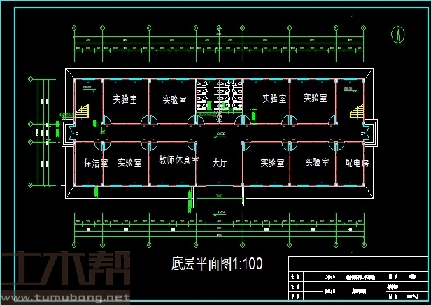 一层:实验室8m*6m*7间,教师休息室8m*6m*1间,男厕4m*6m*1间,女厕4m*6m*1间,楼梯间4.8m*6m*2间,保洁室4.8m*6m*1间,配电房4.8m*6m*1间,大厅8m*6m*1间;