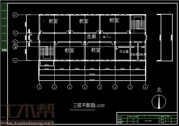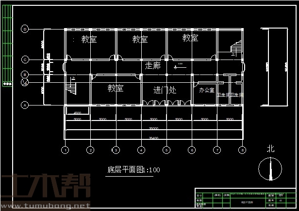 一层:门厅6m*10m*1间,教室6m*10m*4间,办公室5m*6m*1间,楼梯间5m*6m*2间,厕所5m*6m*1间;
