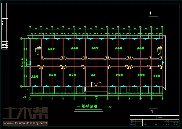 一层:办公室7.2*6.6*9间,卫生间3.6*6.6*2间;