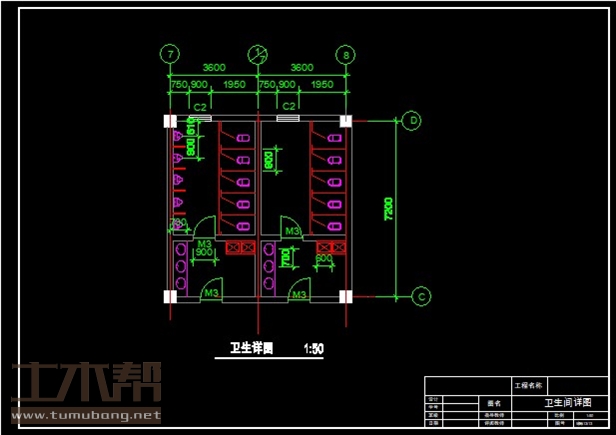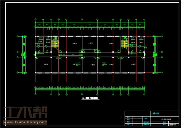 二层:卫生间3.6m*7.2m*4间,大教室10.8m*7.2m*6间,小教室7.2m*7.2m*2间;