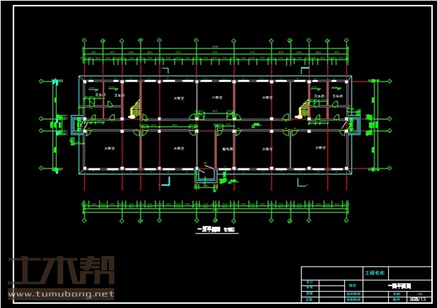一层:卫生间3.6m*7.2m*4间,大教室10.8m*7.2m*6间,小教室7.2m*7.2m*1间,配电房3.6m*7.2m*1间;