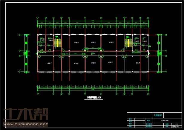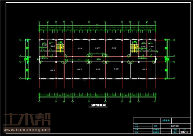 五层:卫生间3.6m*7.2m*4间,办公室10.8m*7.2m*6间,办公室7.2m*7.2m*2间;