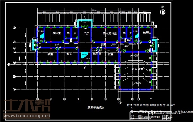 一层:实验室9.9*6.9*1间,图书资料室13.2*6.9*1间,教研室6*6.9*1间、3.3*6.9*1间,,教室9.9*6.9*3间,阶梯教室15*18*1间;