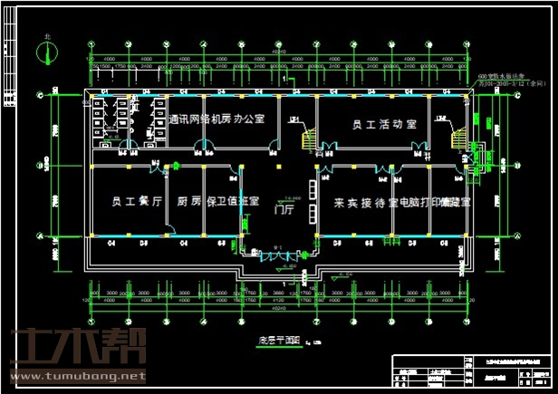 一层:网络机房4*5.9*1间,办公室8*5.9*1间,员工活动室12*5.9*1间,员工餐厅8*7.5*1间,厨房4*7.5*1间,保卫值班室4*7.5*1间,来宾接待室8*7.5*1间,电脑打印室4*7.5*1间,储藏室4*7.5*1间;