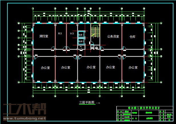 三层:办公室7.5*8.8*5间,仓库7.5*8.8*1间,公务员室7.5*8.8*1间,女卫3.75*8.8*1间,男卫3.75*8.8*1间,清扫室7.5*8.8*1间;