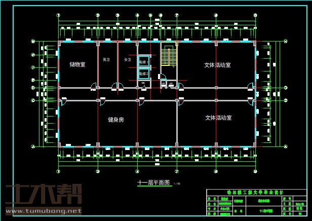 十一层:健身房22.5*8.8*1间,文体活动室15*8.8*2间,女卫3.75*8.8*1间,男卫3.75*8.8*1间,储物室7.5*8.8*1间;