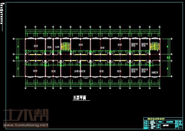 五层:教室9m*7m*7间,教室7m*7m*1间,多媒体教室13.5m*7m*1间,教师休息室4.5m*7m*1间,储物室4.5m*7m*4间,男厕3.5m*7m*1间,女厕3.5m*7m*1间;