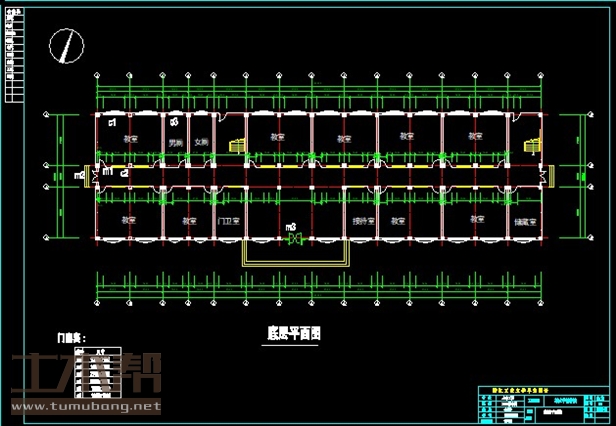 一层:教室9m*7m*8间,教室7m*7m*1间,门卫室4m*7m*1间,接待室4m*7m*1间,储物室4m*7m*1间,男厕3.5m*7m*1间,女厕3.5m*7m*1间;