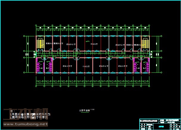 三层:男厕3.6m*6.6m*2间,女厕3.6m*6.6m*2间,综合工作室10.8m*6.6m*2间,小会议室7.2m*6.6m*1间,综合办公室7.2m*6.6m*3间,楼梯间3.6m*6.6m*2间,普通办公室3.6m*6.6m*4间,中会议室14.4m*6.6m*1间;