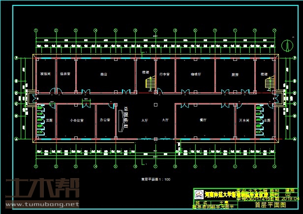 一层:男厕3.9m*6.9m*1间,小会议室7.8m*6.9m*1间,办公室3.9m*6.9m*1间,大厅11.7m*6.9m*1间,餐厅11.7m*6.9m*1间,开水间3.9m*6.9m*1间,女厕3.9m*6.9m*1间,被服间3.9m*6.9m*1间,值班室3.9m*6.9m*1间,商店11.7m*6.9m*1间,楼梯3.9m*6.9m*2间,行李室3.9m*6.9m*1间,咖啡厅7.8m*6.9m*1间,厨房.8m*6.9m*1间;