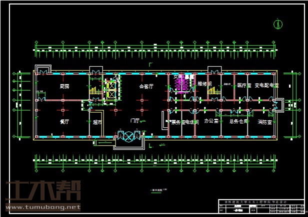 一层:餐厅14.4m*9.9m*1间,超市3.6m*7.2m*1间,门厅18m*7.2m*1间,票务室3.6m*7.2m*1间,电话间3.6m*7.2m*1间,办公室7.2m*7.2m*1间,总务仓库7.2m*7.2m*1间,消防室7.2m*7.2m*1间,厨房14.4m*7.2m*1间,楼梯间3.6m*7.2m*2间,电梯间2.4m*2.4m*2间,会客厅14.4m*7.2m*1间,女厕3.6m*7.2m*1间,男厕3.6m*7.2m*1间,维修间18m*7.2m*1间,杂物间3.6m*7.2m*1间,医疗室3.6m*7.2m*1间,变电配电室7.2m*7.2m*1间;