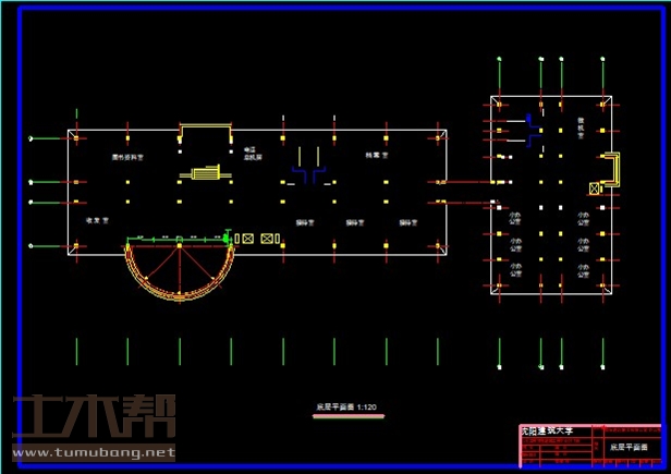 一层:收发室7.8*6.6*1间,图书资料室15.6*6.6*1间,电话总机房7.8*6.6*1间,档案室15.6*6.6*1间,接待室7.8*6.6*3间,卫生间3.9*6.6*2间,小办公室6.3*3.9*6间,微机室6.3*7.8*1间,卫生间6.3*3.9*2间;