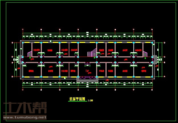 一层:接待室7.8*6*1间,办公室7.8*6*3间,小办公室3.9*6*5间,资料室3.9*6*1间,开水房3.9*6*1间,休息室3.9*6*1间,值班室7.8*6*1间,仪器室7.8*6*1间,男厕3.9*6*1间,女厕3.9*6*1间;