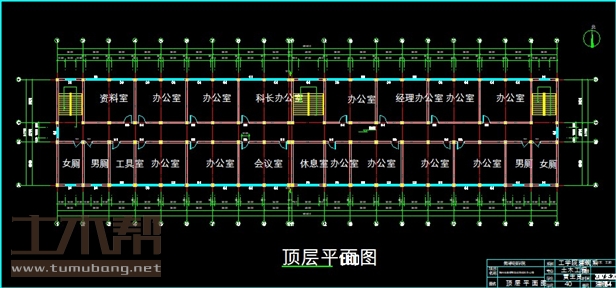 五层:工具室3.6*6*1间,办公室7.2*6*10间,休息室4.5*6*1间,会议室7*6*1间,办公室3.6*6*1间,经理办公室7.2*6*1间,科长办公室7.2*6*1间,资料室7.2*6*1间,男厕3.6*6*2间,女厕3.6*6*2间;