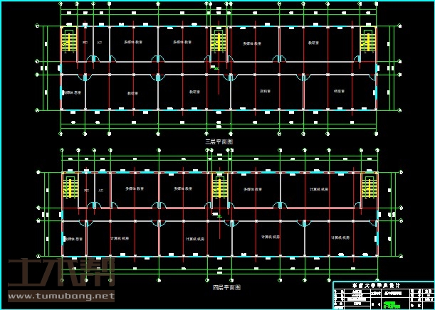 四层:教师休息室4.5*6.6*1间,计算机房13.5*6.6*4间,多媒体教室9*6.6*3间,男卫3*6.6*1间,女厕3*6.6*1间;
