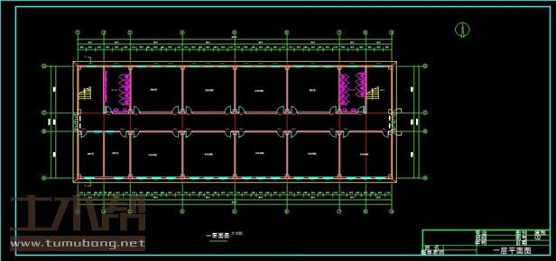 一层:值班室4.2m*7.5m*1间,收发室4.2m*7.5m*1间,教室8.4m*7.5m*9间,男卫生间4.2m*7.5m*1间,女卫生间4.2m*7.5m*1间,楼梯间4.2m*7.5m*2间;