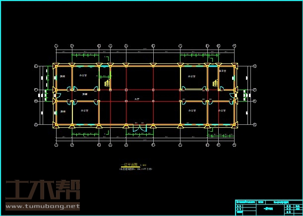 一层:厕所4.2m*6.3m*2间,办公室7.2m*6.3m*5间,大厅21.6m*15.6m*1间,保卫室4.2m*6.3m*1间,楼梯间3m*6.3m*2间;