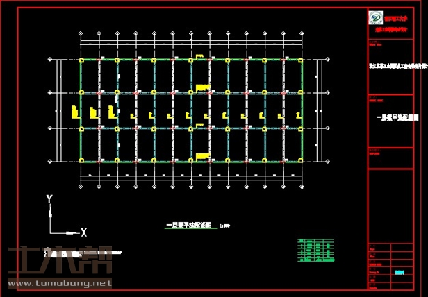 建筑长49.5m,宽22.875m.一榀框架首层层高4.2m二至五层层高为3.6m,柱距3.3m,3跨,跨度6m,6.3m,6m;
