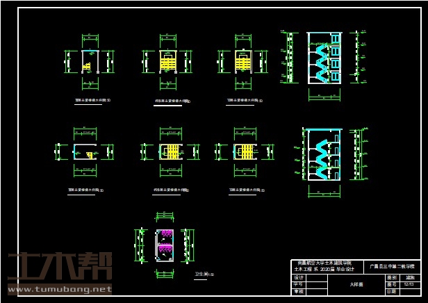 二至四层:卫生间4.5m*4.5m*2间,房间9m*6.3m*6间,,楼梯间4.5m*6.3m*1间,楼梯间4.2m*6.3m*1间;