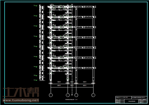 建筑长58.2m,宽33m.一榀框架首层层高4.75m,二至七层层高3.6m,,柱距6m,3跨,跨度6m,3m,6m;