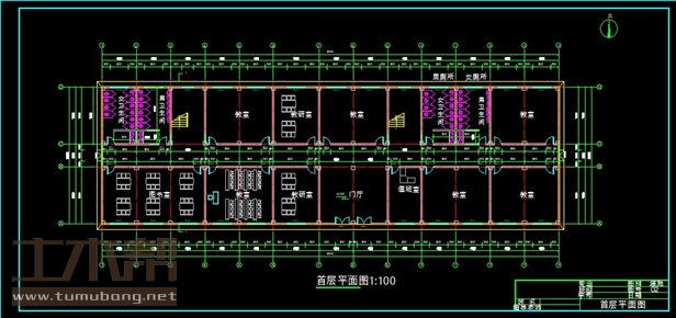一层:图书室13.5m*7.5m*1间,教室9m*7.5m*6间,教研室6m*7.5m*1间,门厅9m*7.5m*1间,值班室4.5m*7.5m*1间,女卫生间4.5m*7.5m*2间,男卫生间4.5m*7.5m*2间,楼梯间4.5m*7.5m*2间,教研室6m*7.5m*1间;