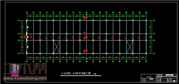 建筑长59.9m,宽17m.一榀框架首层层高4.95m,二至四层3.6m,柱距6.6m,3跨,跨度6.6m,3.3m,,6.6m;