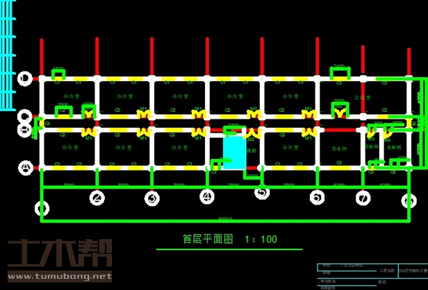 一至五层:办公室7.5m*5.2m*9间,楼梯间7.5m*5.2m*1间,茶水间6.25m*5.2m*1间,会议室12.5m*5.2m*1间,男厕2.5m*5.2m*1间,女厕3.75m*5.2m*1间;
