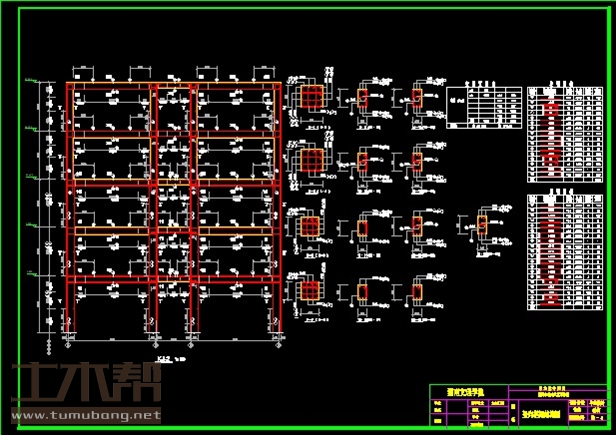 建筑长54.6m,宽17.4m.一榀框架首层层高5m,二至五层3.3m,柱距7.6m,3跨,跨度6m,2.4m,6m;
