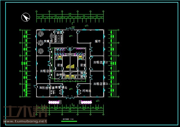 一层:消防控制室6m*6m*1间,大楼管理处6m*6m*1间,问讯处6m*6m*1间,出租店面6m*12m*1间,出租店面6m*13.2m*1间,出租店面6m*7.2m*1间,快餐部6m*12m*1间,厨房3.6m*6m*1间,超市12m*12m*1间,杂物间3.6m*3.6m*1间,电梯井2.4m*1.8m*4间,弱电间3.6m*1.8m*1间,强电间3.6m*1.8m*1间,前室3.6m*5.4m*2间,楼梯间3.6m*7.2m*2间,卫生间3.6m*7.2m*2间;