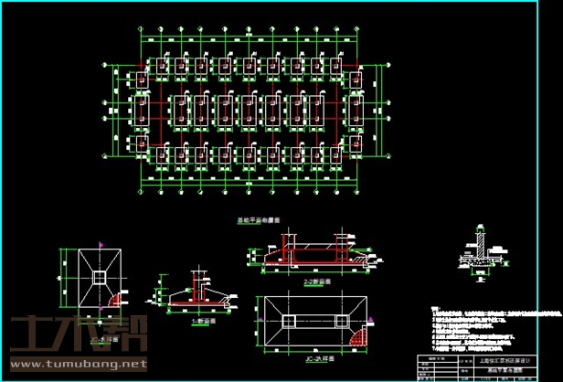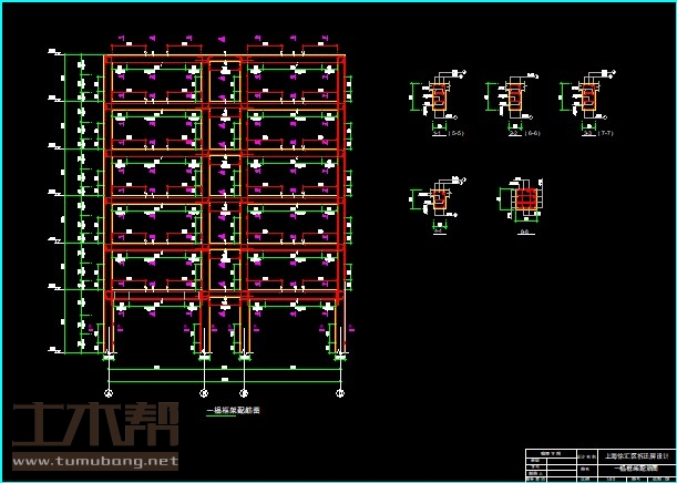 建筑长32.4m,宽13.8m.一榀框架首层层高3.5m,二至六层2.8m,柱距3.6m,3跨,跨度5.7m,2.4m,5.7m;