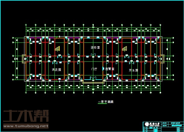 一层:宿舍4m*7.4m*17间,洗衣房8m*7.4m*1间,门厅8m*7.4m*1间,宿管室4m*7.4m*1间,开水房8m*7.4m*1间,楼梯间4m*7.4m*2间,活动室8m*7.4m*1间;