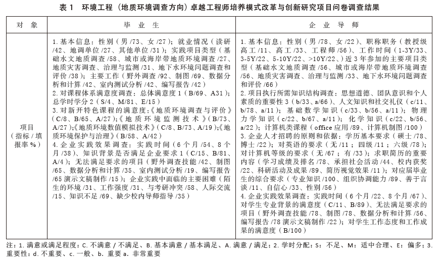卓越工程师培养计划采用校企联合培养、通用 + 行业标准联合培养的基本模式,以高质量技术人才 为培养目标 [1-4]。中国地质大学(武汉)环境工程(地 质环境调查方向)卓越工程师计划自 2012 年开始试点,至 2016 年,已有 3届毕业生完成了本科阶段 的培养。通过对 2届毕业生( 26份)和企业导师(10 份)的问卷调查,初步了解了从本科学习到工作岗 位在知识结构和从业能力方面所存在的差异。如何 激发学生学习兴趣、构建完整的知识结构和提升地 质环境调查的从业能力?这一问题是制订培养计划 和改革培养模式的核心 [5-6]。本文在问卷调查的基 础上, 分析了毕业生和企业单位对专业知识结构 认识的差异,从课堂教学、实习实践教学两方面 提出了环境工程(地质环境调查方向)卓越工程师 培养模式改革的建议。