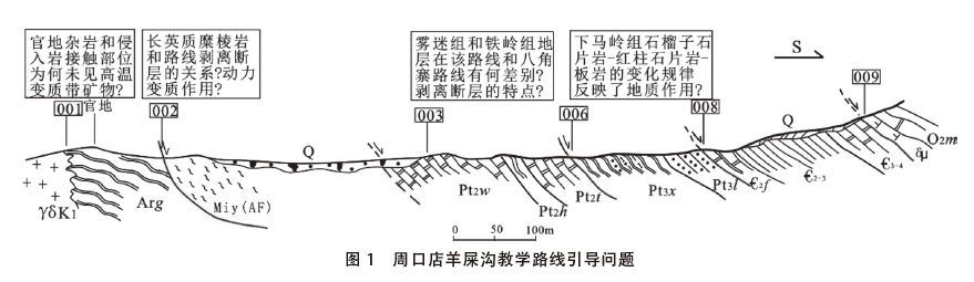 (2)在地质现象前提出问题,引导学生结合课 堂知识进行深入思考。 例如: 在周口店羊屎沟路 线中,可以让学生总结剥离断层存在的证据和特 点,引导他们分析该路线地层厚度减薄或缺失、糜 棱岩和断层带等地质现象间的关系。同时,结合路 线中所见到的热变质矿物,提出岩浆活动和热变质 作用相关的问题,如:下马岭组内的热变质带是如 何形成的,是否和断层活动有关?如何判断龙山组(Pt3l)上覆大理岩的地层时代为(